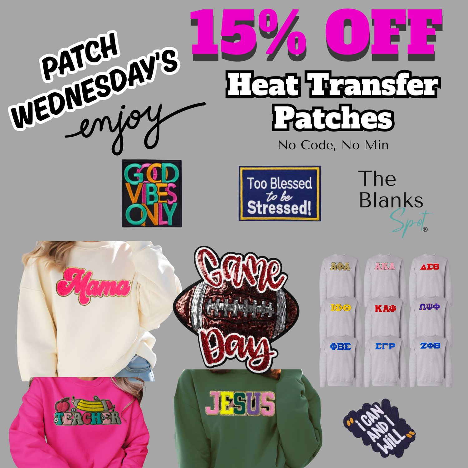 Patches Pressing Instructions: Temperature: 375 Degrees Fahrenheit Time: 15-20 Seconds Pressure: High Pressure - ALWAYS PRE-PRESS THE...