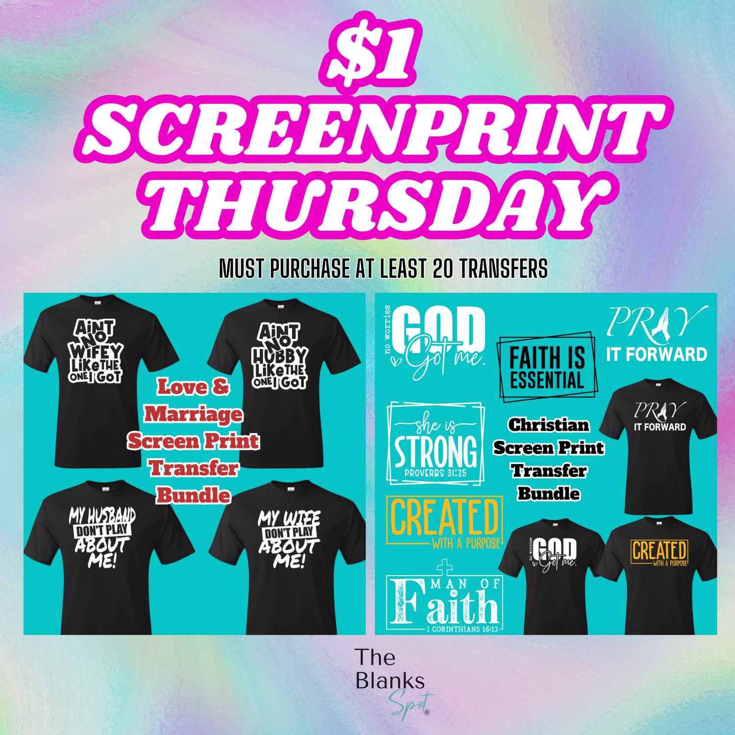 SCREENPRINT THURSDAY ($1 Single Color Transfers every Thursday) Min Purchase 20 Transfers