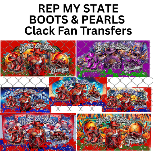 BOOTS & PEARLS (REP MY STATE) CLACK FAN TRANSFERS (SINGLES) (Sublimation)(Ready to Press)