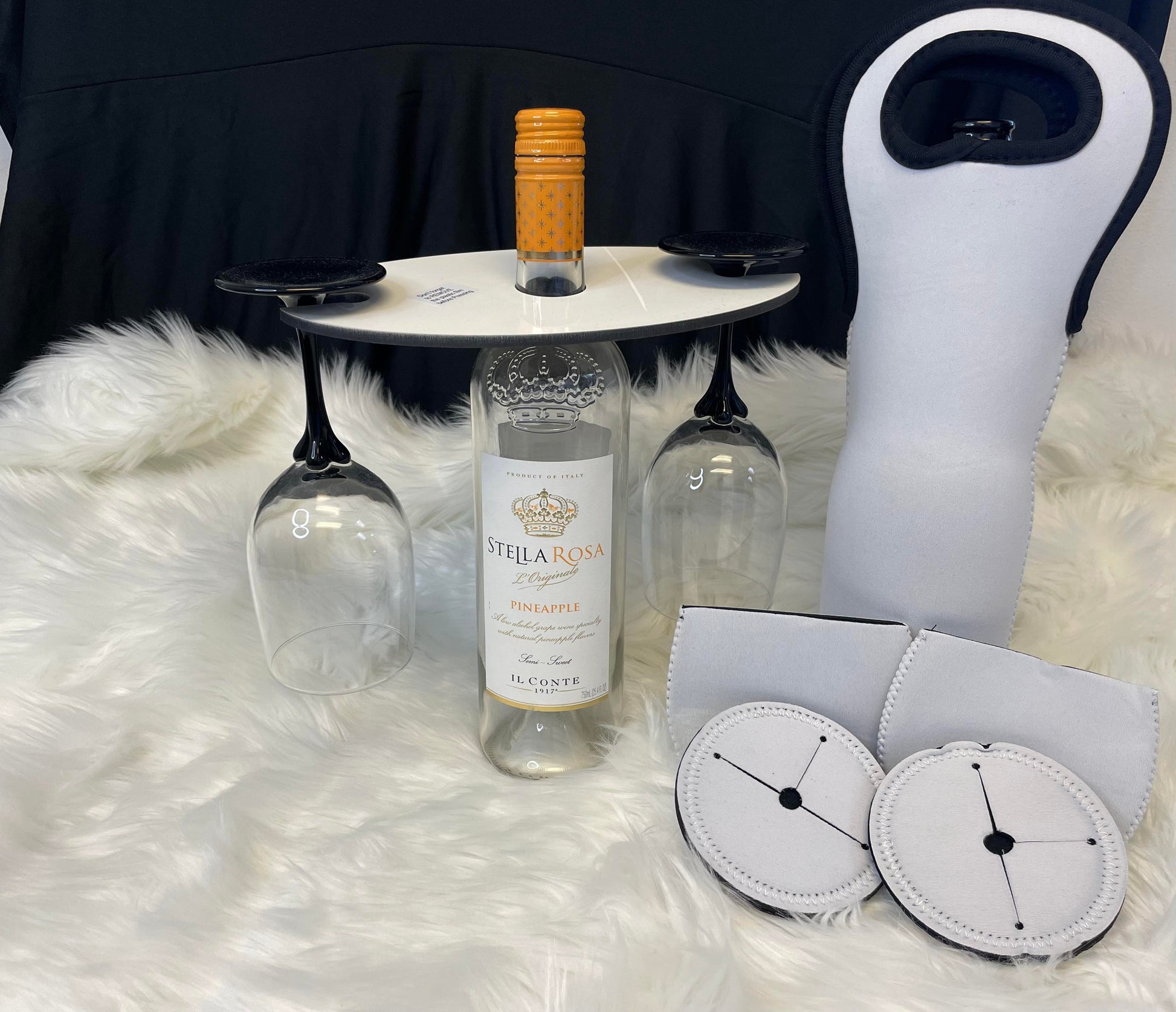 This is a great gift any time of the year. This Bundle includes (1) Wine Bag, (1) 2 OR 4 Glass Wine Holder (2) Wine Glass Koozies (2) Wine Glass Coasters