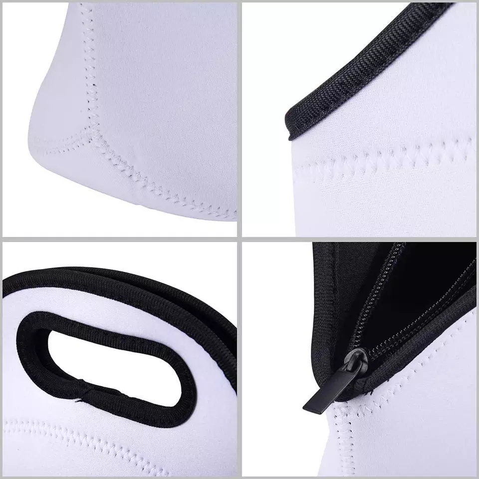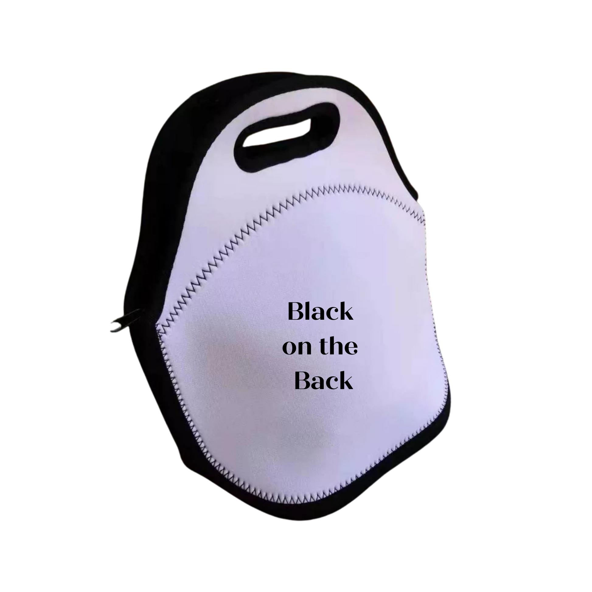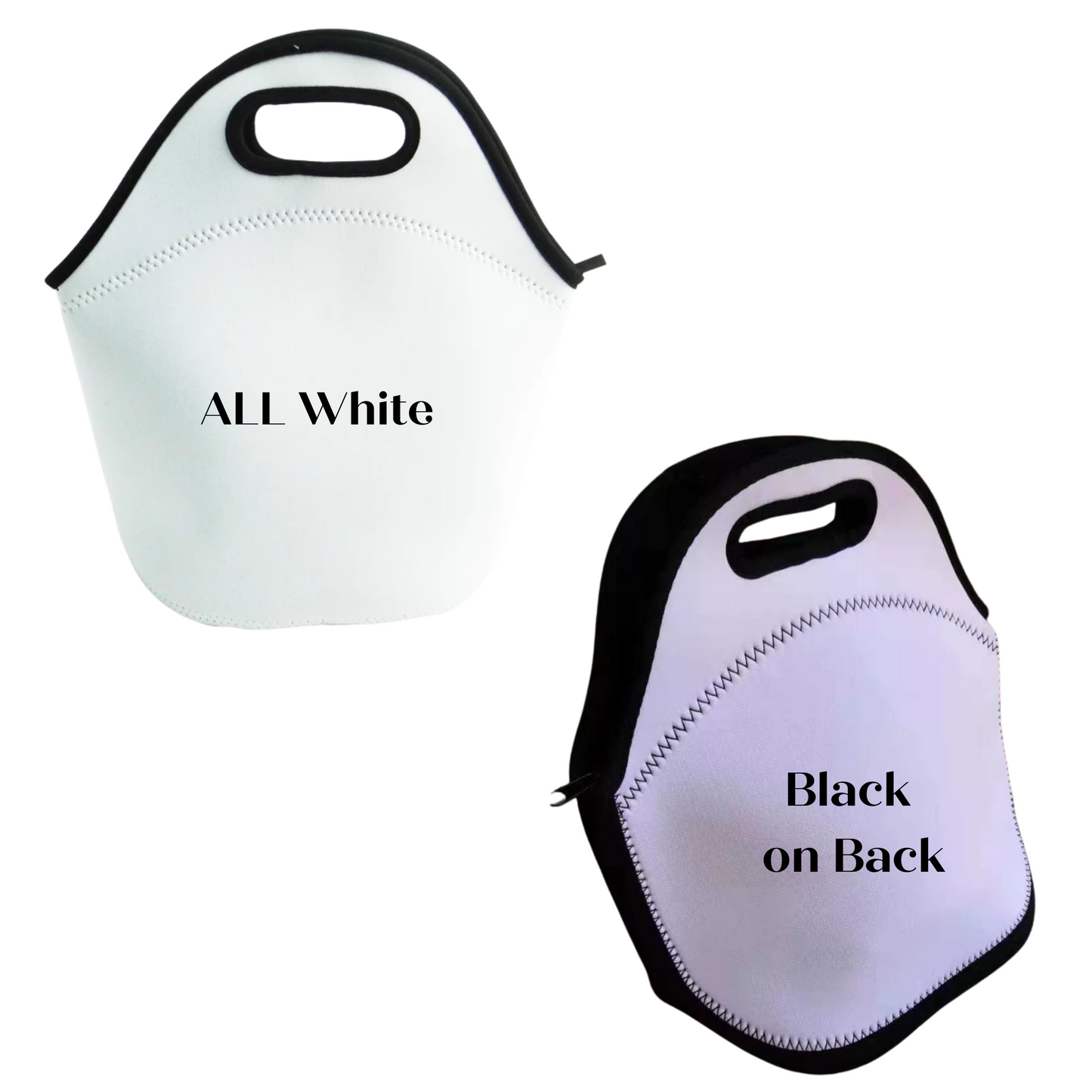 Grab this neoprene lunch tote for the and customize for the ultimate gift. Has a zipper to close. Comes in All White or Black on the back...
