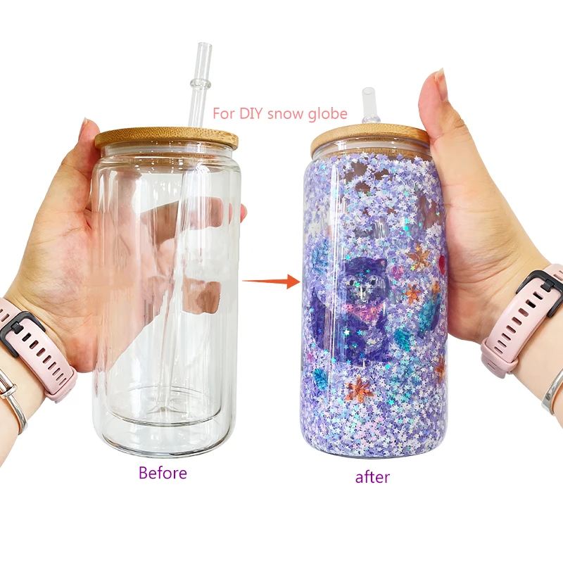 This Double Wall Snow Globe Glass Jar will make a great gift for any holiday. Size is 15oz (Inside).
