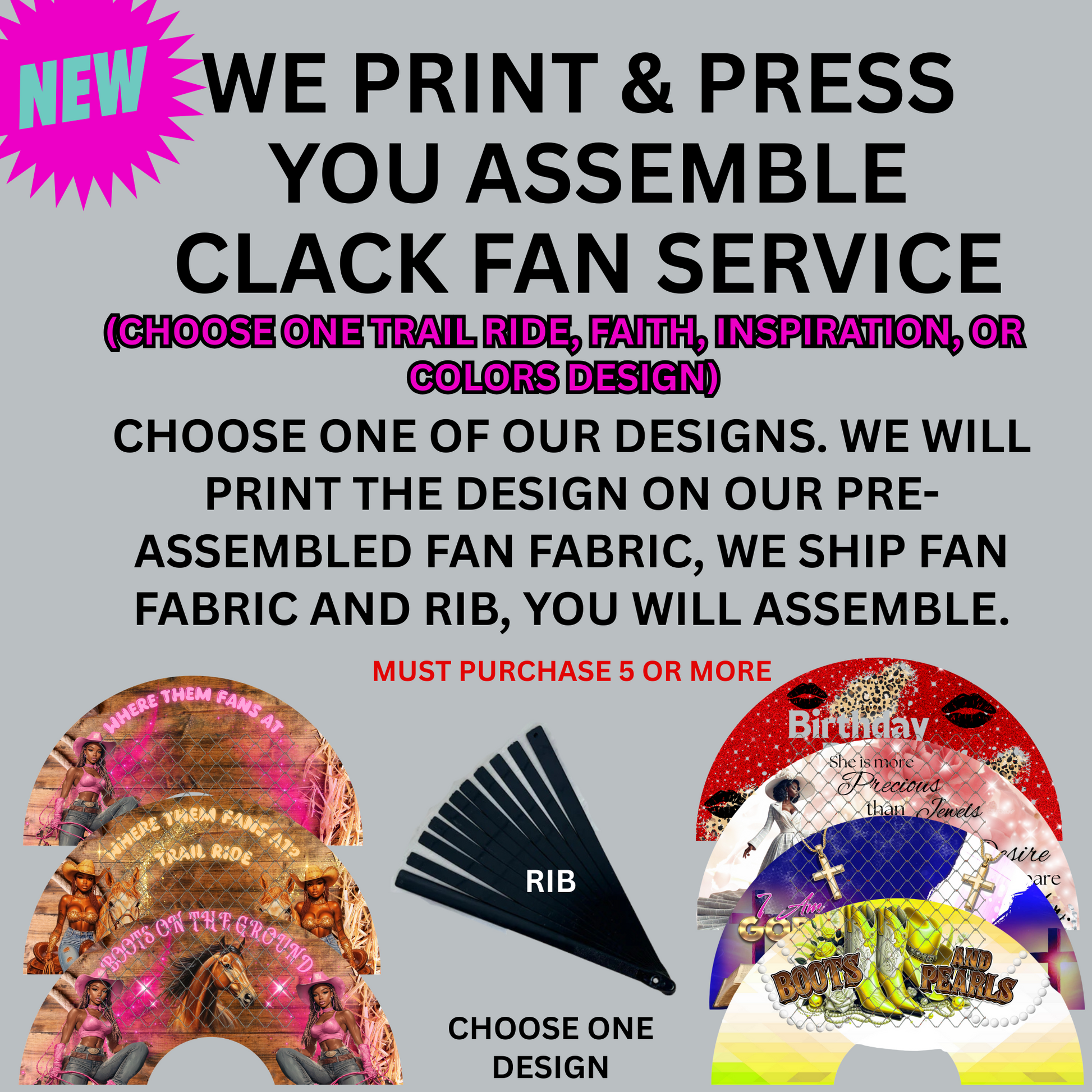 WE PRINT & PRESS, YOU ASSEMBLE - CLACK FAN - (TRAIL RIDE)(FAITH)(INSPIRATION) (COLORS)